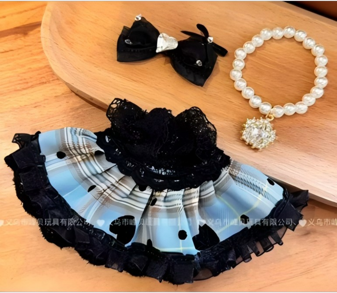 Blue And Black Plaid Princess Dress Set (Bow + Dress + Necklace)