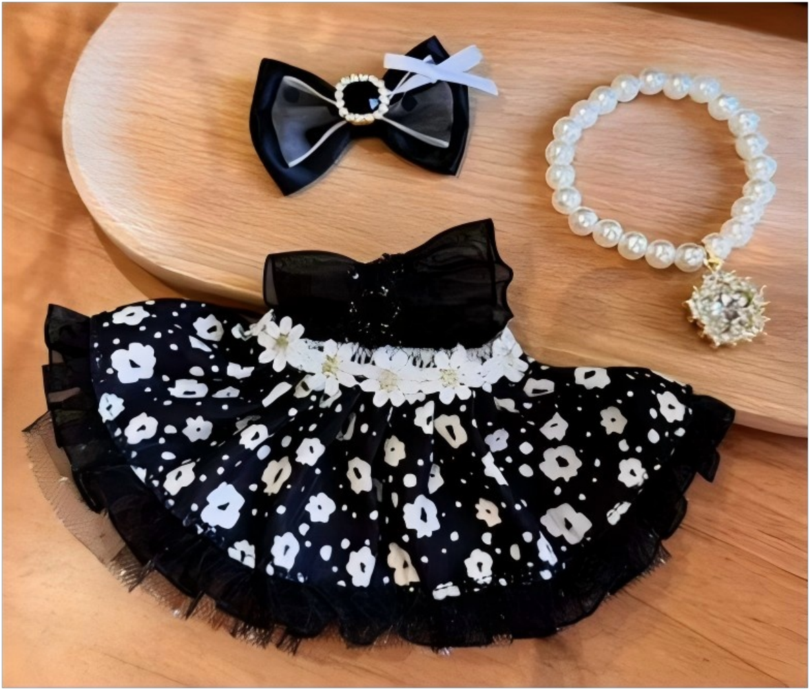 White flower Princess black dress Set (Bow + Dress + Necklace)
